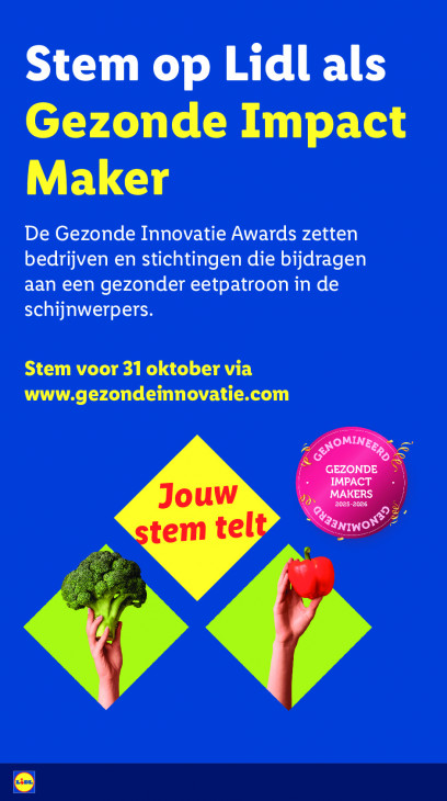 Stem op Lidl als Gezonde Impact Maker De Gezonde Innovatie Awards zetten bedrijven en stichtingen die bijdragen aan een gezonder eetpatroon in de schijnwerpers. Stem voor 31 oktober via www.gezondeinnovatie.com